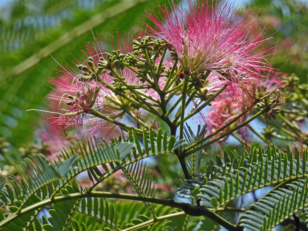 合歓の木の花と蕾 美しい多数の赤いのが雄蕊で、その中に混じる1本の白いのが雌蕊