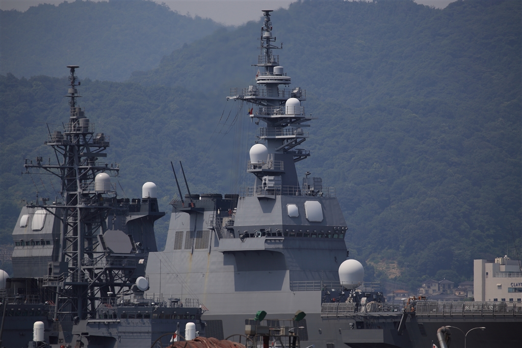 ひゅうが型「いせ」艦橋上部の四角いレーダーが大小2個あります。