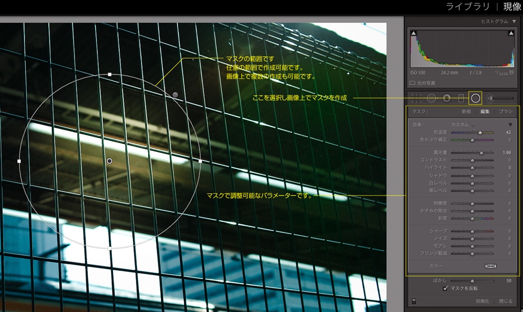 画像上の円の範囲内がマスクによる調整範囲です。