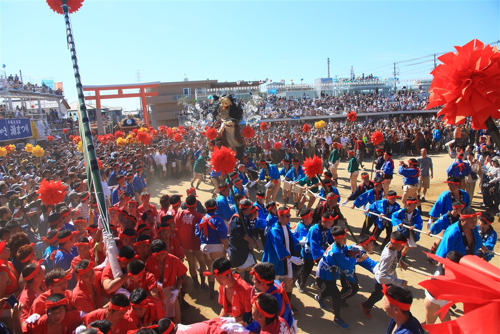 松原八幡神社の境内に威勢よく入ってくる屋台(毛獅子が乗っている)