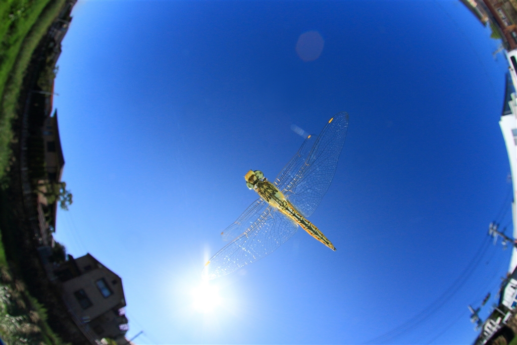 ウスバキトンボが秋空の下を飛ぶ