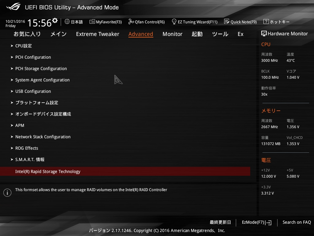 UEFIの設定画面。Intel Rapid Storage Technologyが表示されています。