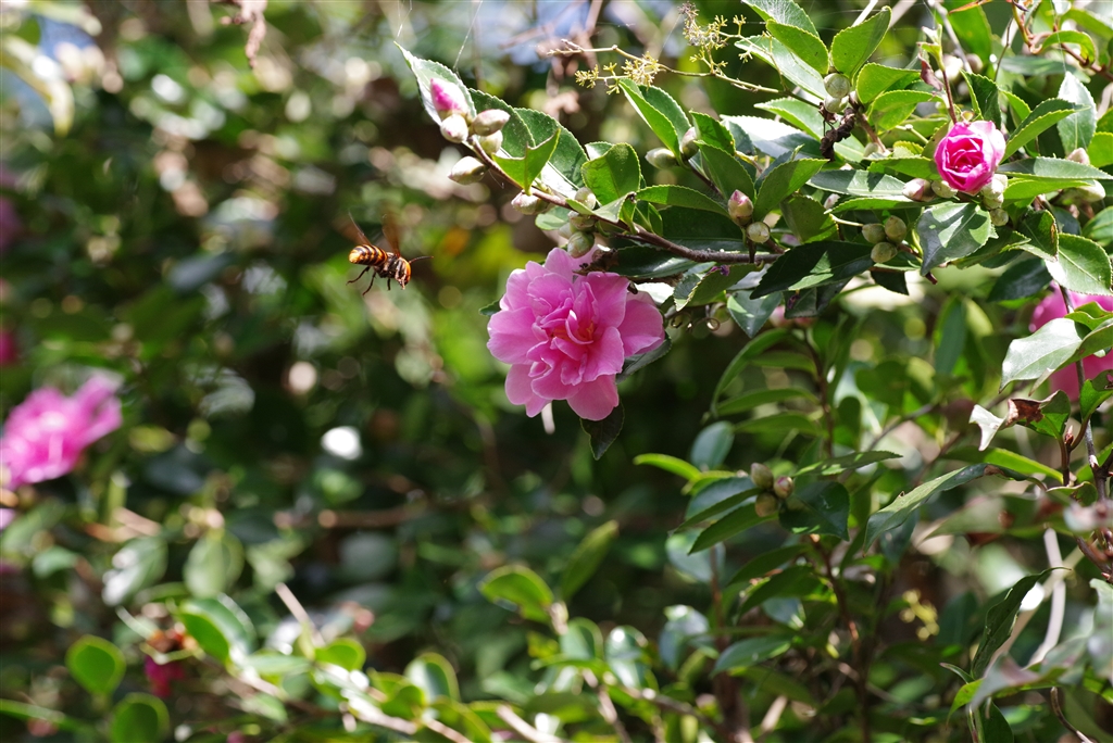 「くる禁」 サザンカ?にコガタスズメバチ