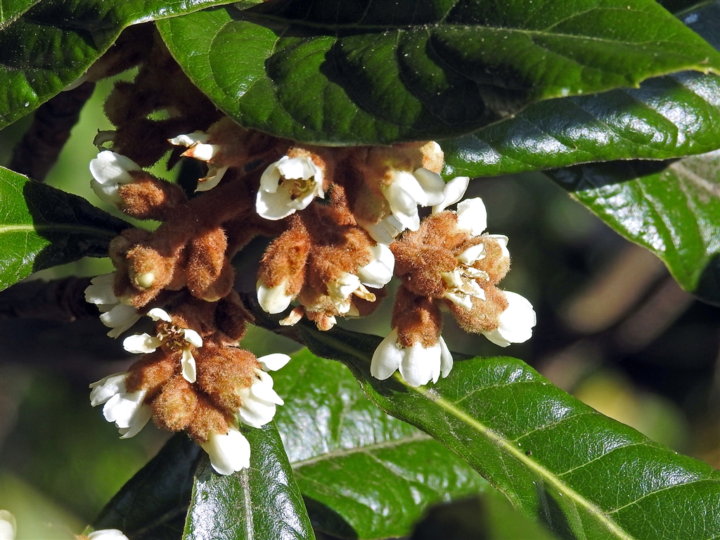 ビワ(枇杷)の花 冬に葉の陰の枝先に芳香の良い白い五弁の小花。結実はまだ見た事ない