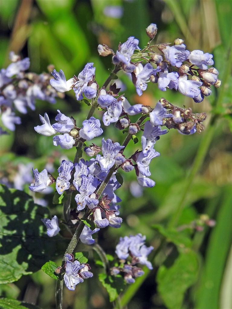 ヤマハッカ(山薄荷)青紫の小さな唇形花がまばらに咲き、鋸歯の葉や茎に毛。香りなし