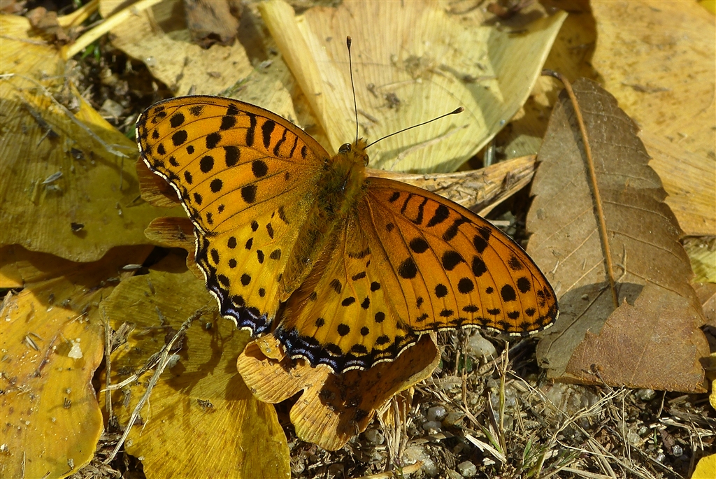 イチョウの落ち葉にチョウがとまる