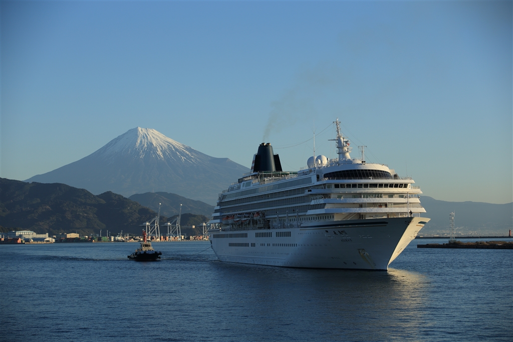 富士山を背景に悠々と入港・・・・雲一つない快晴でした