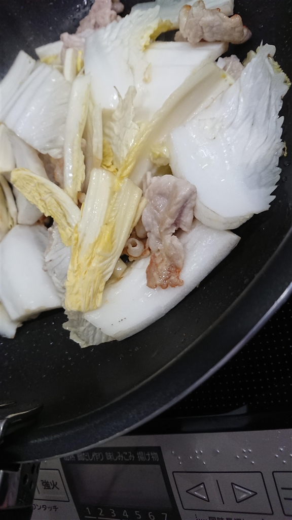 豚バラを軽く炒めてから白菜の厚い部分を投入します。