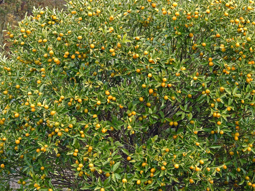 ブッシュをかき分け進んだ先の空間に、人知れず実るキンカン(金柑)の実