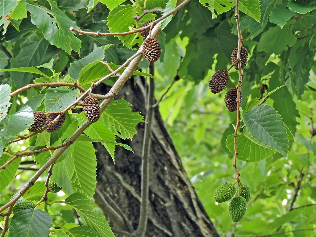 オオバヤシャブシの新緑の葉と昨年の実(茶色)と今年の実(緑色)