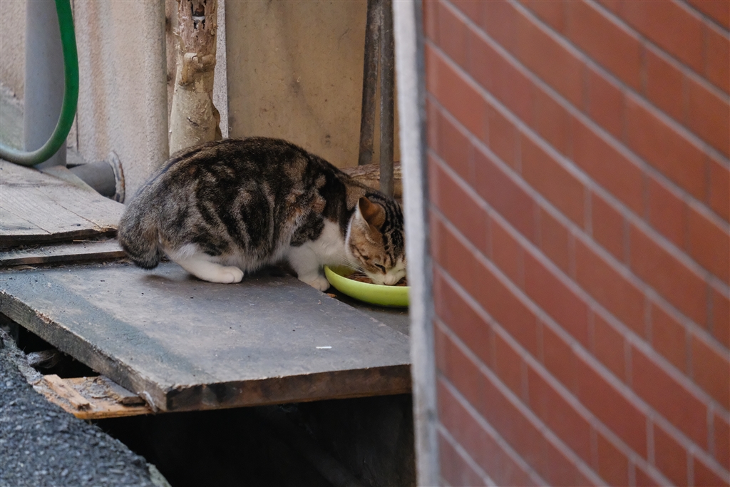 餌を食べている猫の・・・