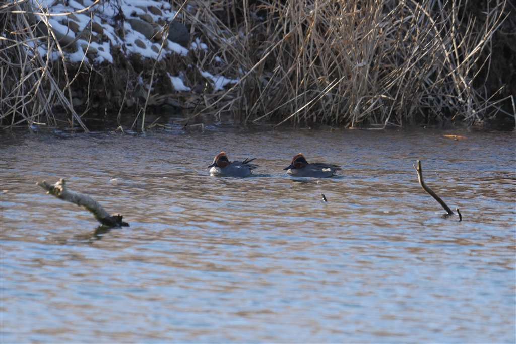 強風で2羽とも後頭部が・・・なコガモ