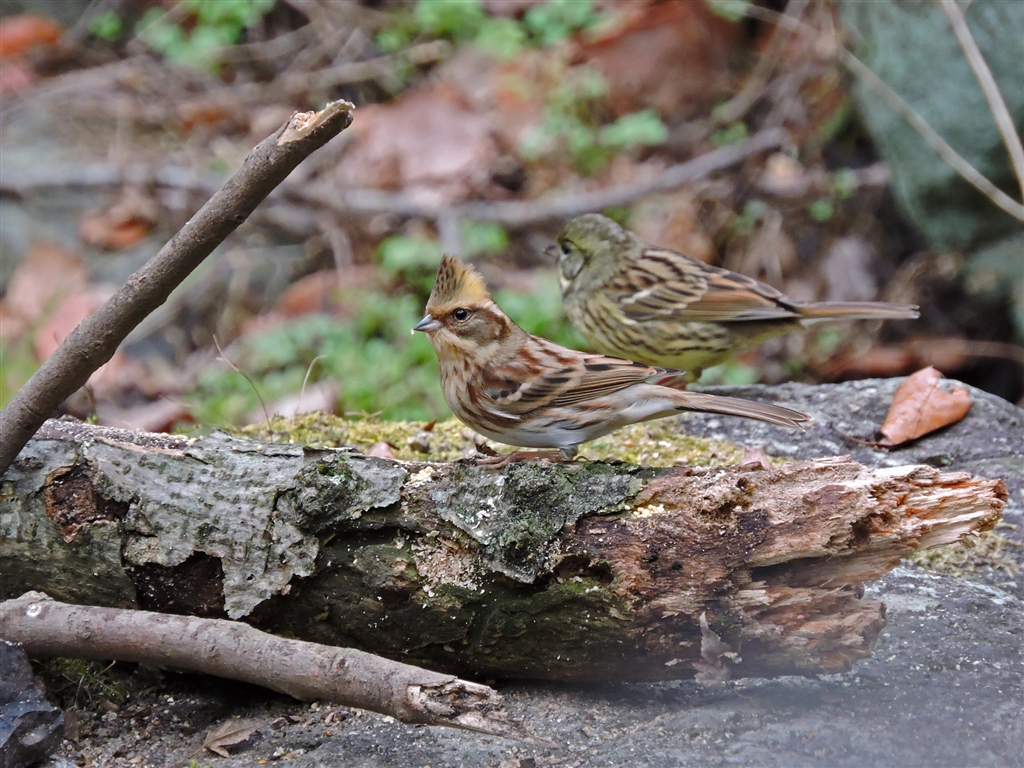 参考 深度が浅く向うのアオジがボケてますがミヤマホオジロ♀とアオジのツーショット