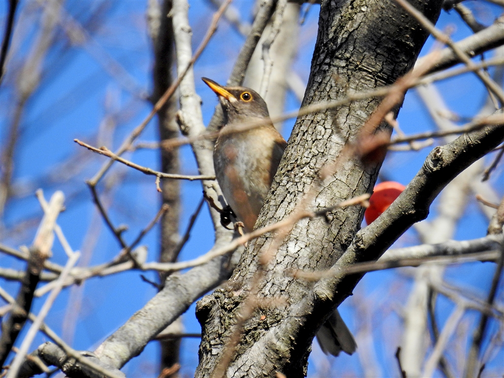 胸と腹に熟柿のの汁を点々と付けてアカハラになってしまったシロハラ