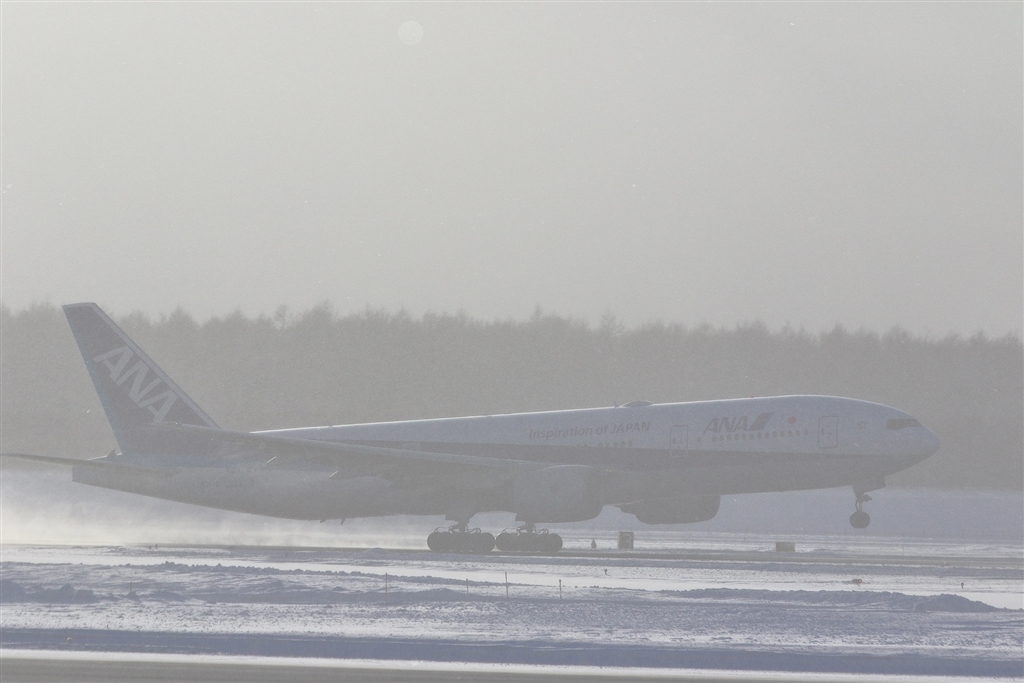 降雪の中、日差しを浴びてテイクオフ↗