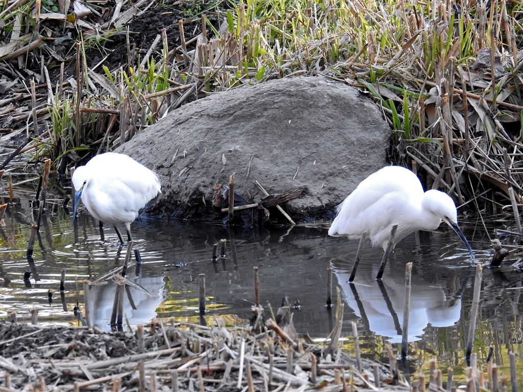 コサギ のペアが腹が減ったなあと捕食中