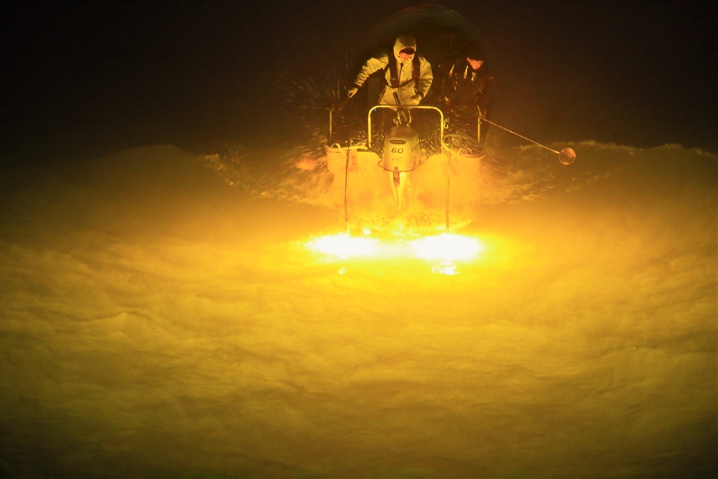 北風で波立つ河口でシラスウナギがいる方向に舵を取っています