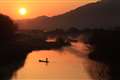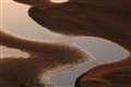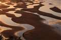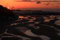 日の出前後に干潮になり、晴れる見込みの冬場(空気が澄んで見通しのよい時期)に行くと、砂地と水面は染まり、それが織り成す造形美が現れます。