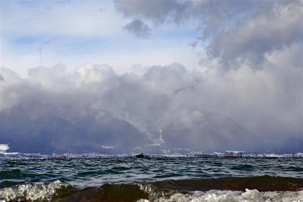 琵琶湖湖岸から対岸遠望。。比良山も雪が吹雪いています