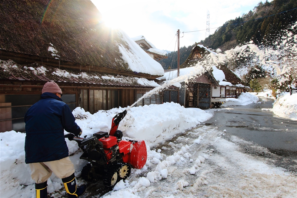 路地の除雪は手押し式除雪機で(かやぶきの古民家&太陽)
