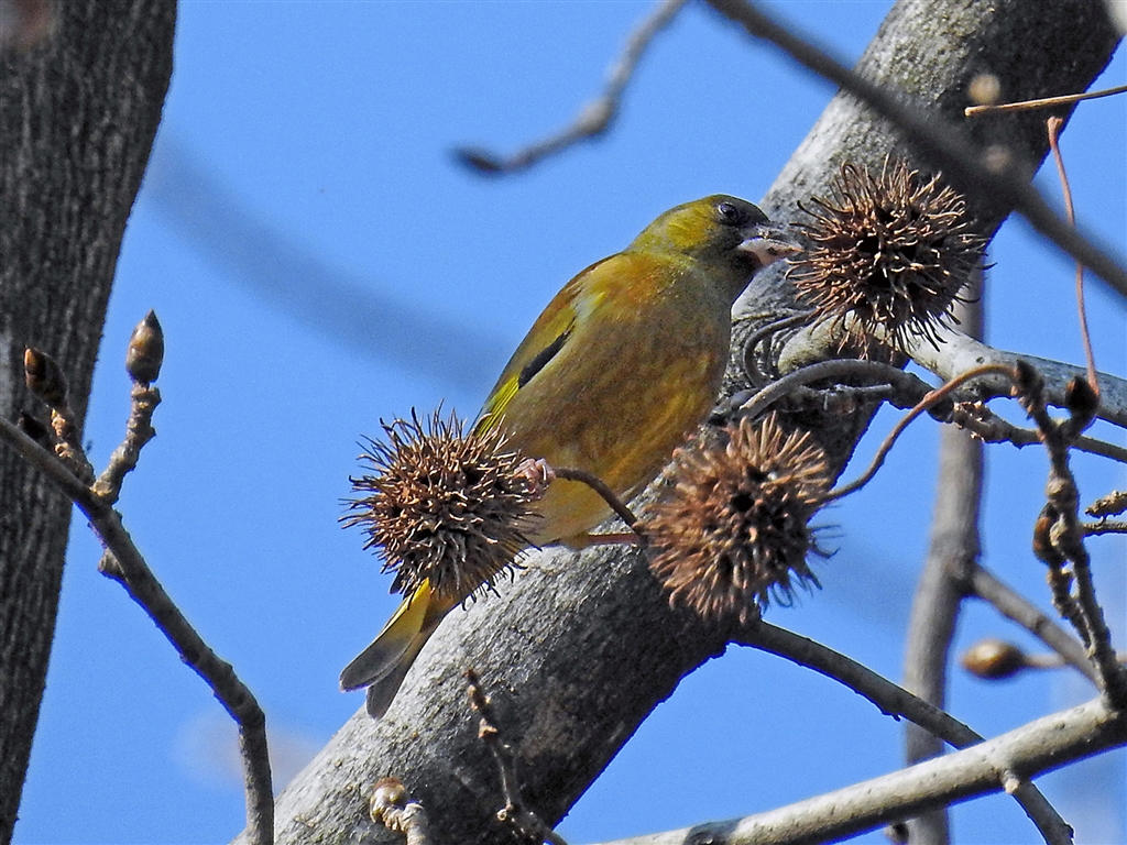 首が痛くなる程の高木フウ(楓)の天辺に残った実を食うマヒワ 換算2000mm