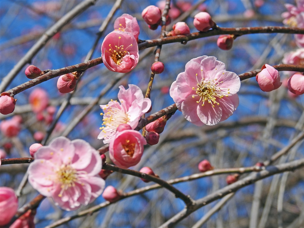 枝垂れ紅梅の一部をクローズアップ