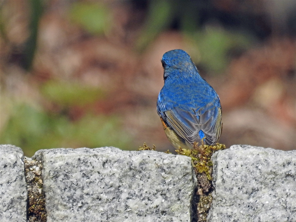 ルリビタキ♂の美しい背中。も少し近くへと、動いた途端に後ろ向きサヨナラ、ア〜ア