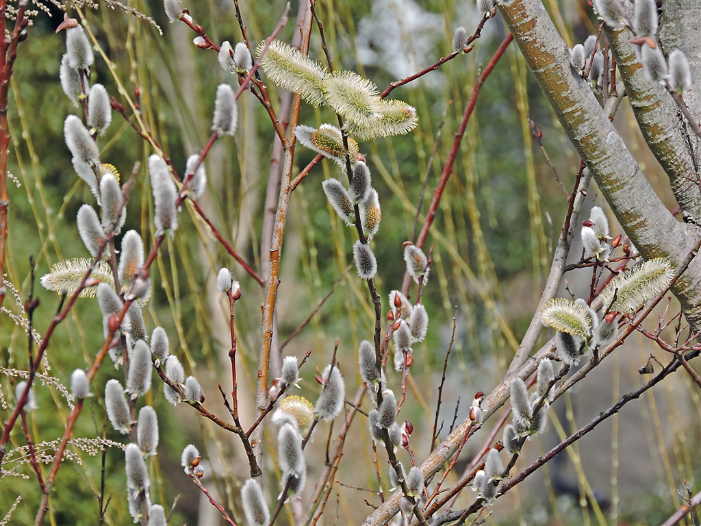 通常のネコヤナギ 小さい赤茶が葉芽の芽鱗。花芽の芽鱗は殆んど脱げて綿毛が出ている