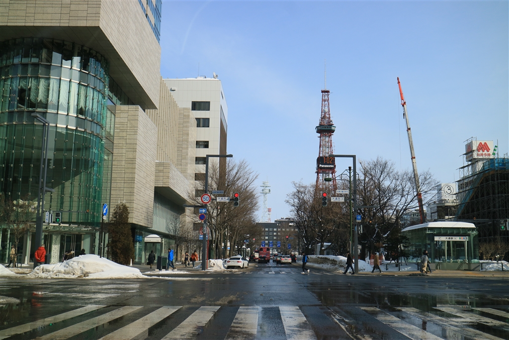 西4丁目通りで信号待ち。東向き、右が大通り公園です