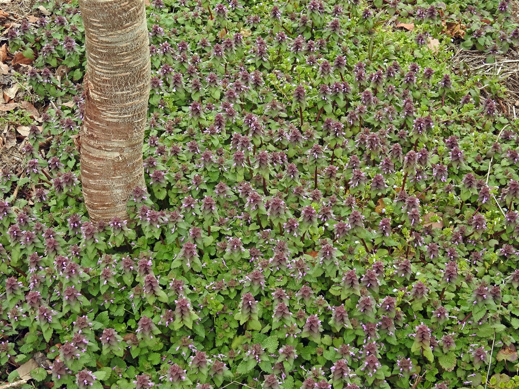 桜の根元を埋め尽くすヒメオドリコソウ(姫踊り子草)の群落