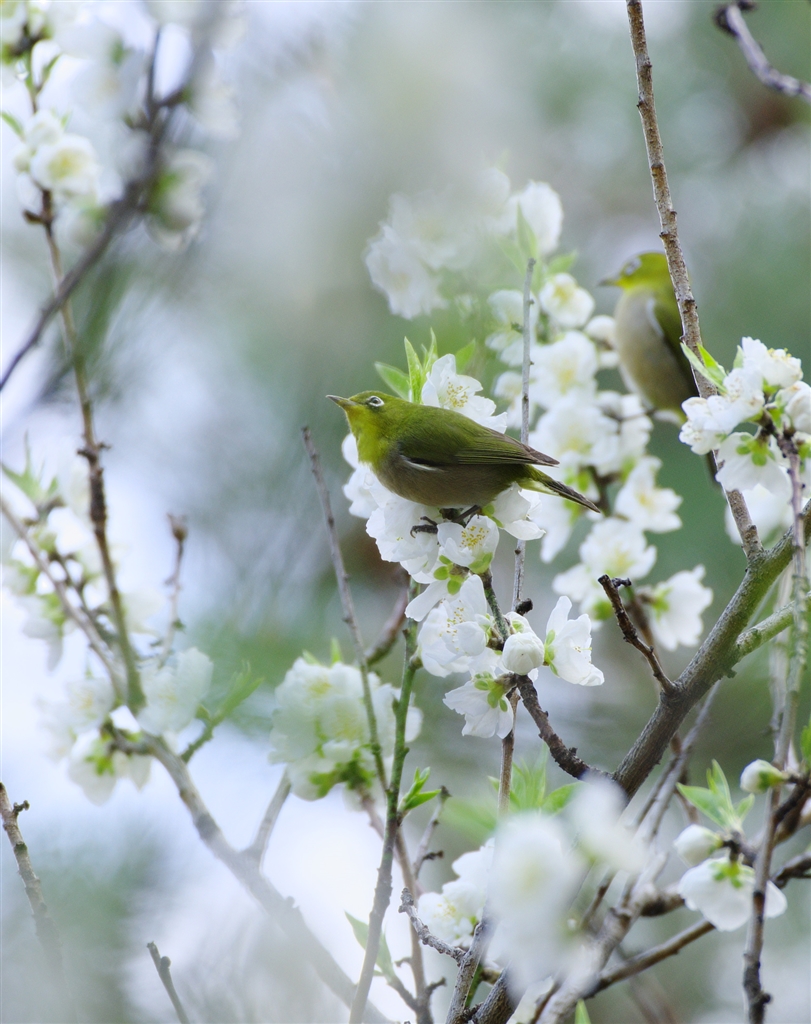 桃の花の中でメジロが楽しそうに飛び跳ねていました。