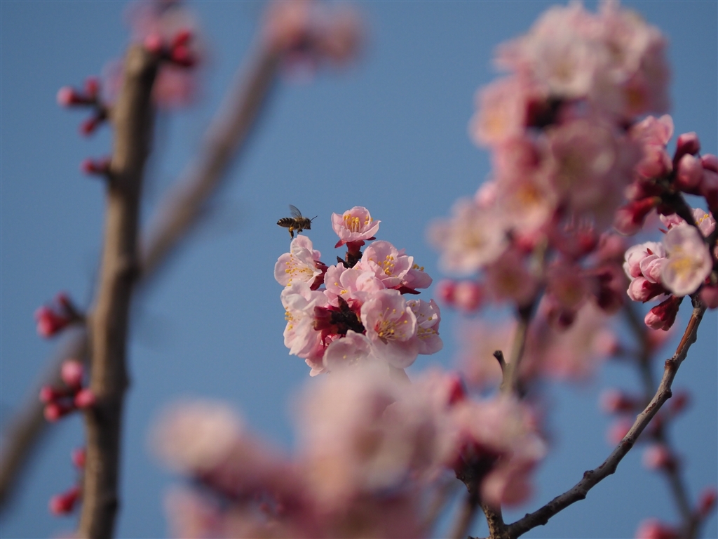 偕楽園公園の桃には夕方まで「くる禁」のニホンミツバチ(?)