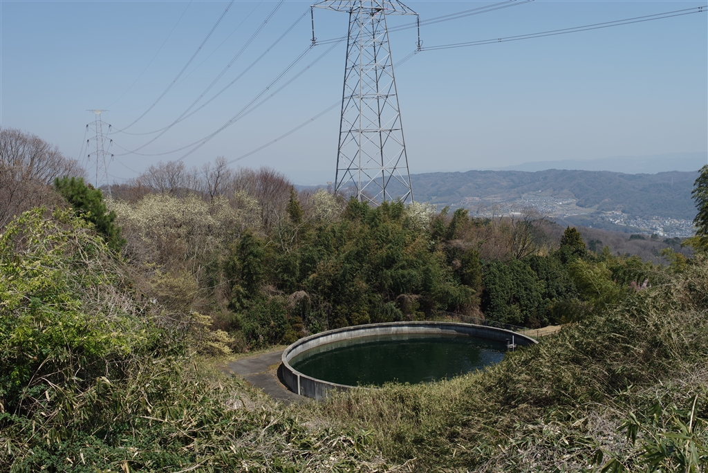 円形の貯水池とモクレンと奈良県側