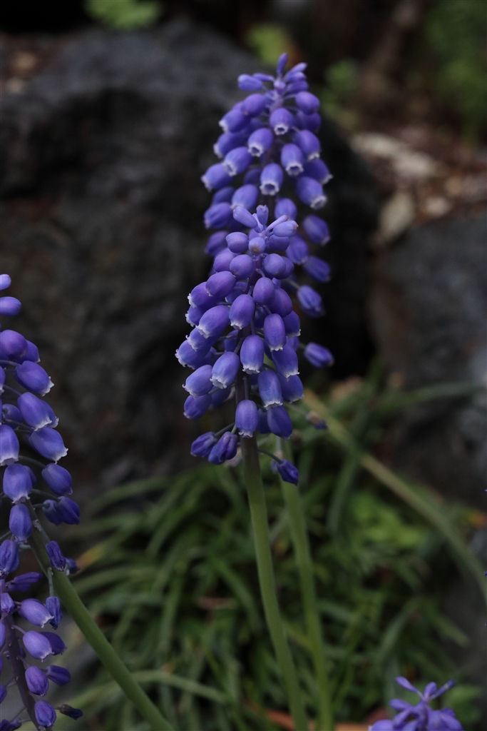 ムスカリ。。鉢植えはもう峠を越してダメで岩陰に咲いてのでスナップ