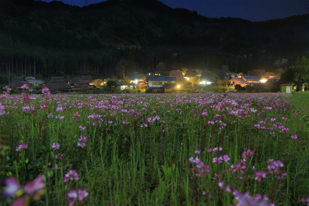 誰そ彼?どきのかやぶきの里(夕景:18:38と夜景:19:44のコンポジット)