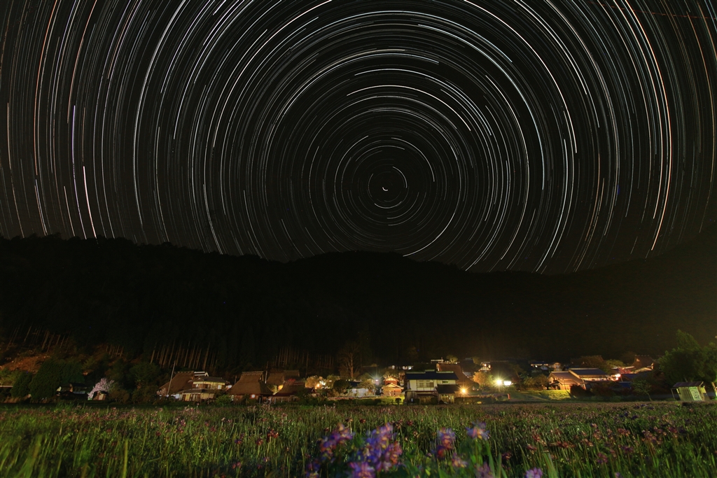 レンゲとかやぶきの里の上で星が日周運動をする(20:12〜13:33までの5時間21分)