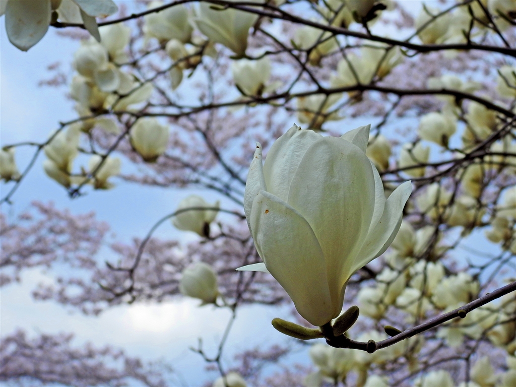 ハクモクレン(白木蓮)まだ頑張る。花期には葉を付けない。花は完全には開き切らない