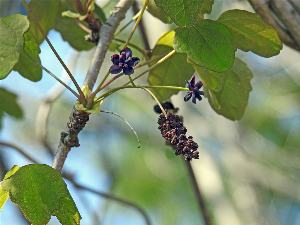 ミツバアケビ(三葉木通)の花 房状に垂れる雄花 雌花はその上方に開いている