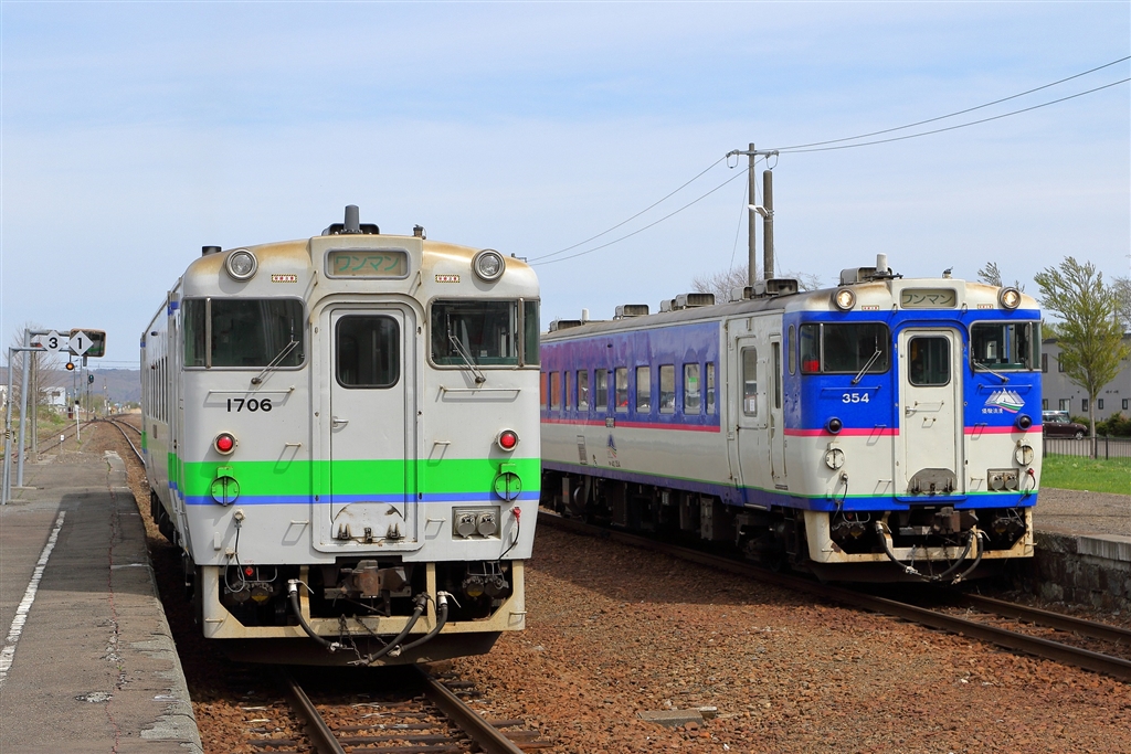 標準色(下り)と日高色(上り)のキハ40どうしの交換です。