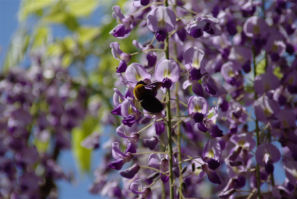 三大神社の藤…蜂が盛んに蜜を吸っていました。