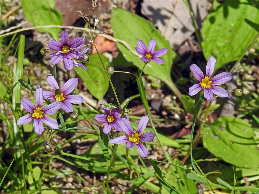庭石菖 花色は白と赤紫と淡青の3色。中央部は黄色で共通。受粉すると一日でしぼむ