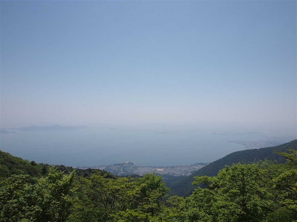 稜線より琵琶湖を望む…霞みがちで遠くは見えず。