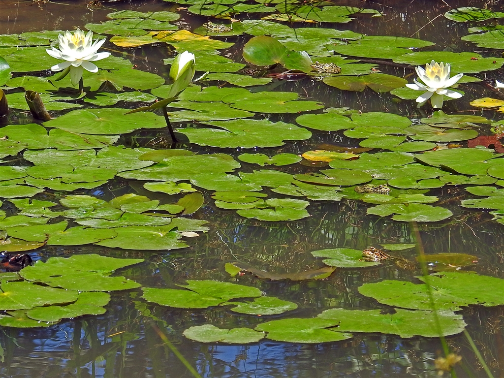 里山の小さな池に咲くヒツジグサ(未草)と蛙4匹 日本自生の世界最小のスイレン。