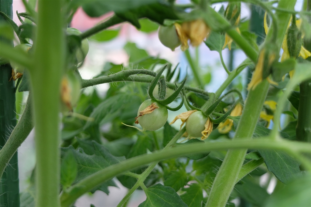 プランターをビニールで覆い過保護に育てているトマト