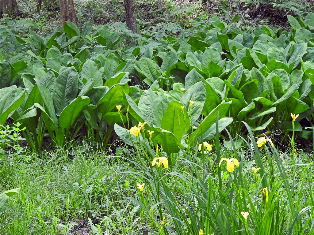 スレ主さんへ お化け芭蕉がここまでになりました。手前のキショウブとの比較をどうぞ