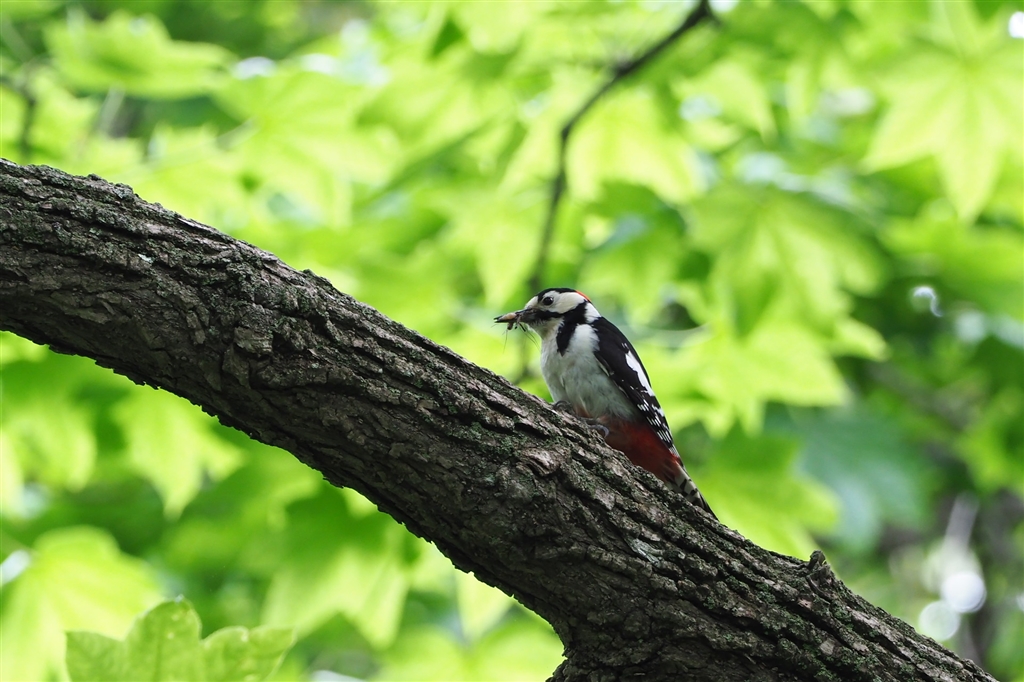 アカゲラ(オス)が餌を持って・・・巣立ちを即す?