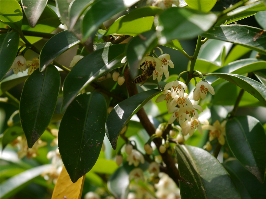 神社の境内に咲いていた榊…ヒサカキより大きな花で白い。