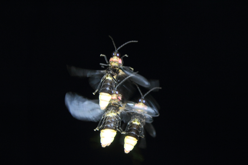 飛んでいるホタルにLED光(閃光時間:1/1000秒)を3連発させて撮影