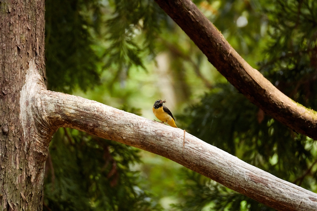 キセキレイの親が餌を加えて子どもをしきりに呼んでいる