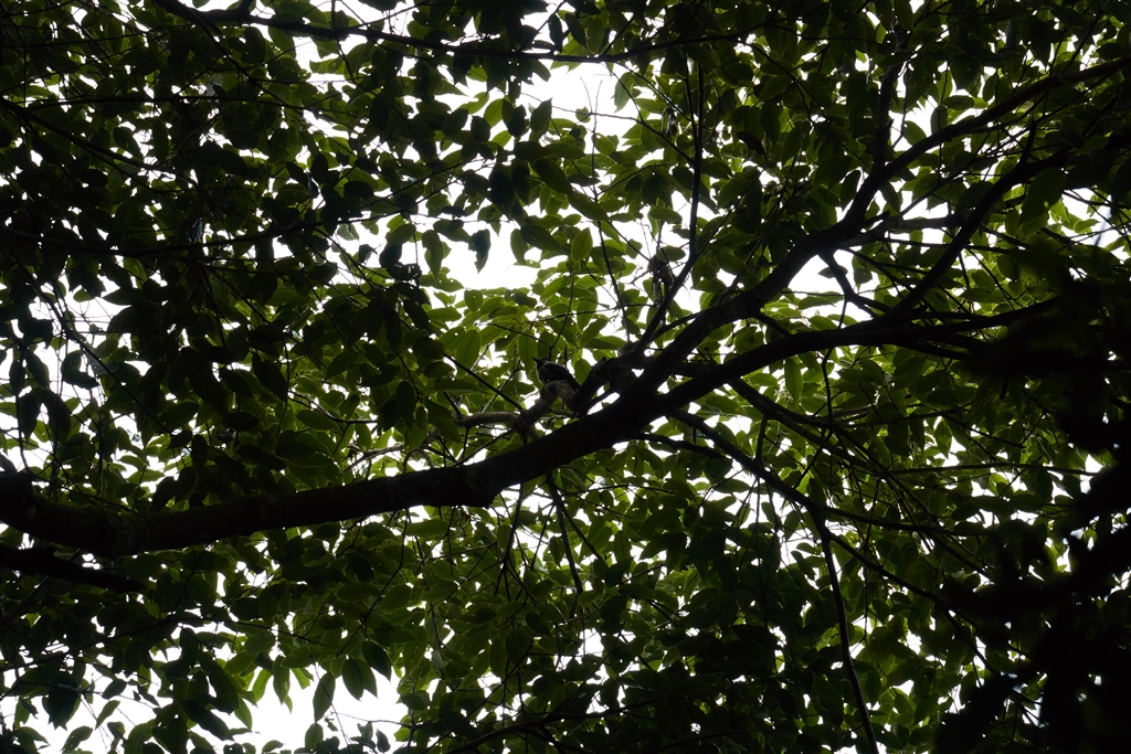 現場の逆光イメージ 葉間の空とのコントラストはもっと強い感じ(中央はヤマガラ)